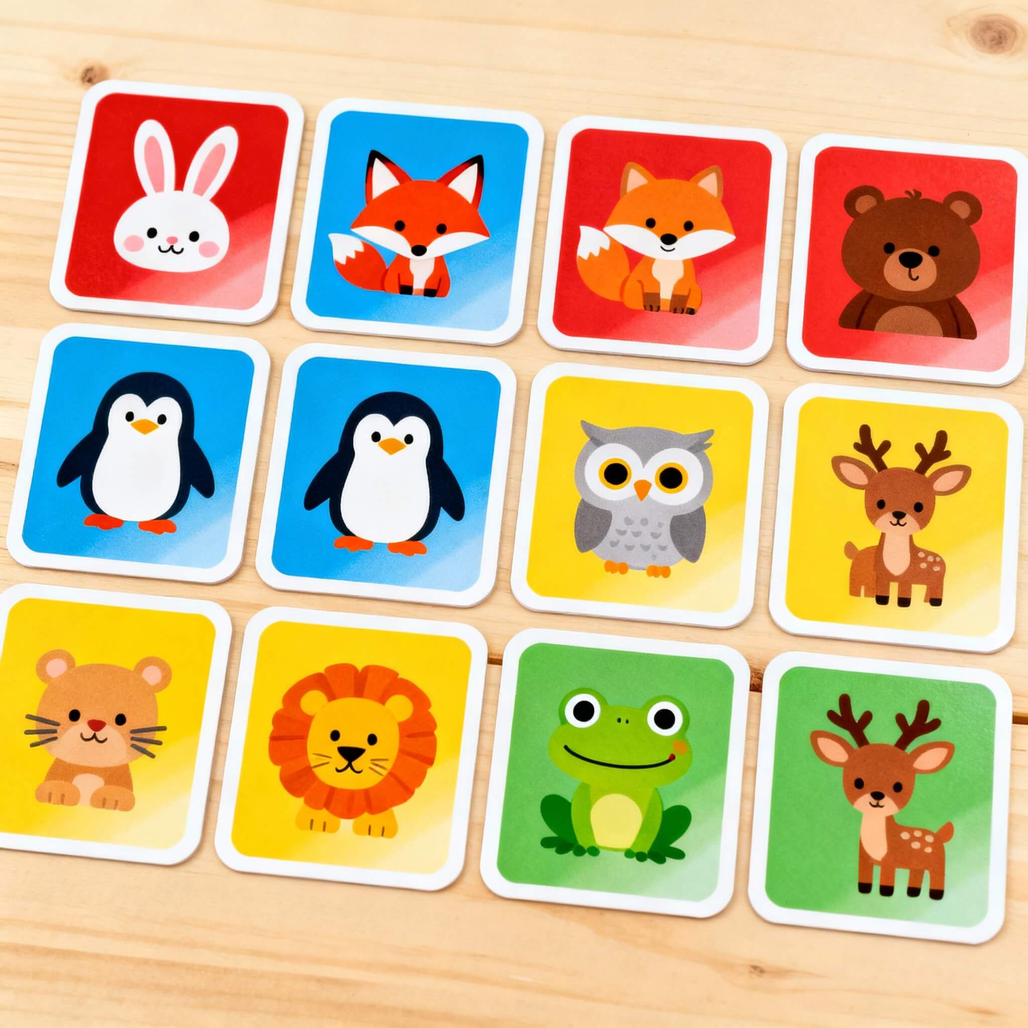 Kolorowa gra memory ze zwierzątkami, idealna dla dzieci 3-6 lat.