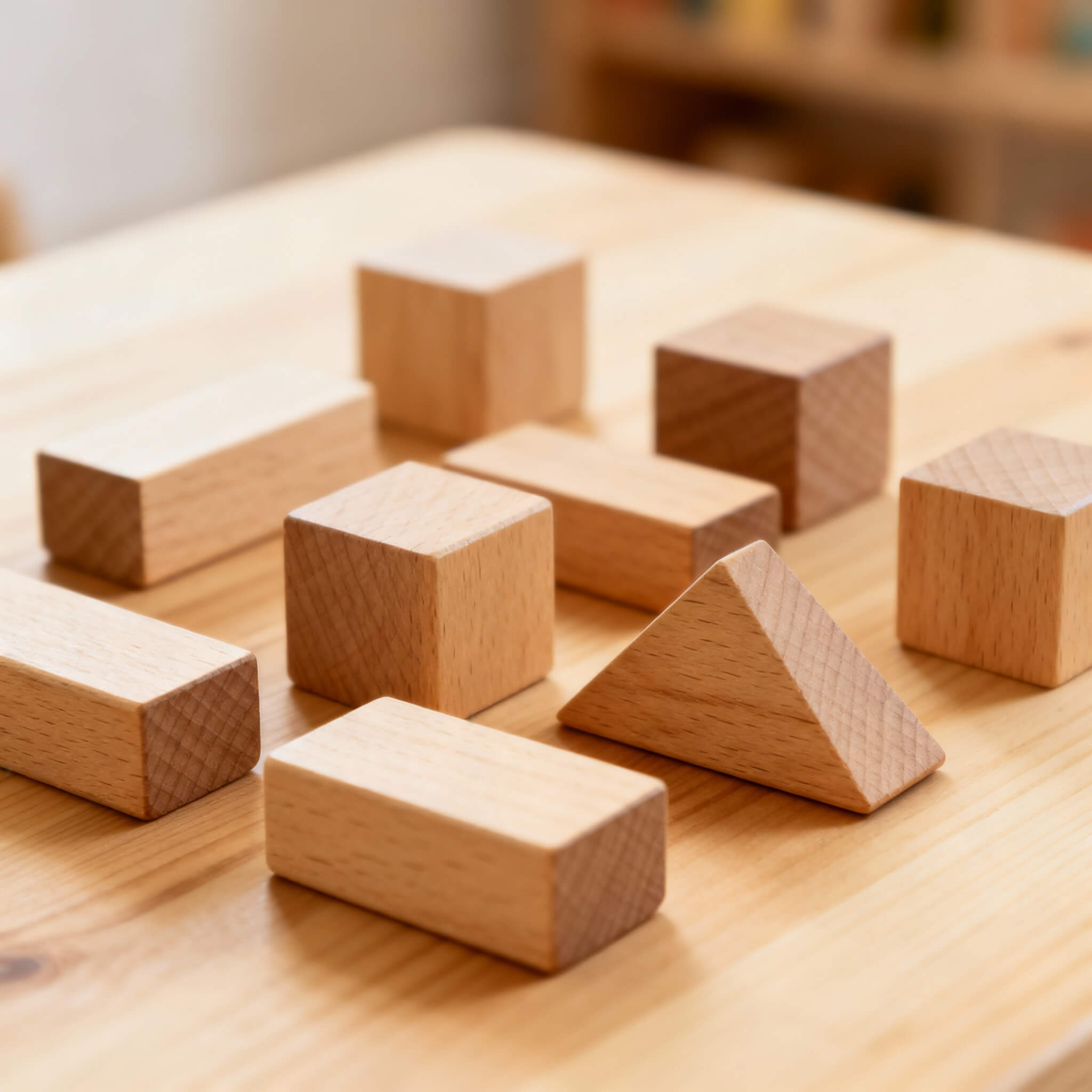 Zestaw 50 drewnianych klocków różnych kształtów. Wszystkie elementy kompletne.